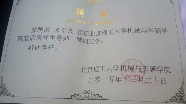近日,北京理工大學正式下發(fā)聘書,聘請我司袁軍民總經(jīng)理擔任北京理工大學機械與車輛學院兼職研究生導師,聘期三年。